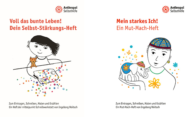 Das kreative Selbst-Stärkungs-Heft wendet sich mit seinen Anregungen, Ideen und Fragen speziell an Menschen mit Assistenzbedarf. Das Heft hat 52 Seiten mit viel Platz zum Eintragen, Schreiben, Malen und Erzählen. Es ist ein Projekt der mittelpunkt-Schreibwerkstatt von Anthropoi Selbsthilfe, konzipiert und gezeichnet von Ingeborg Woitsch. Wir danken der Förderung des mittelpunkt-Projekts durch die Stiftung Lauenstein.